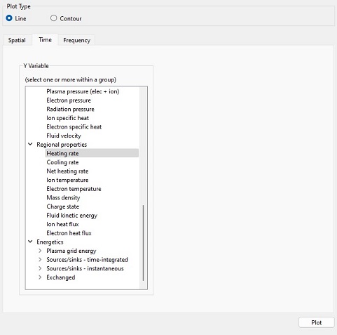 The properties of spatial regions (i.e., averaged over all zones within a spatial region) can be plotted vs. time.