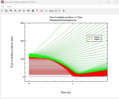 The flow of mass in a HELIOS simulation can be observed by displaying the zone positions vs. time. Because HELIOS is a Lagrangian hydrodynamics code, the movement of the zone boundaries shows how mass moves with time.
