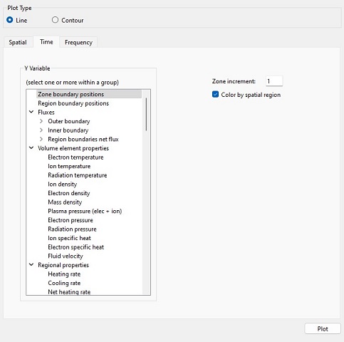 The list of available quantities to plot is shown in the box on the left. Depending on which quantity is selected, additional input is specified on the right.