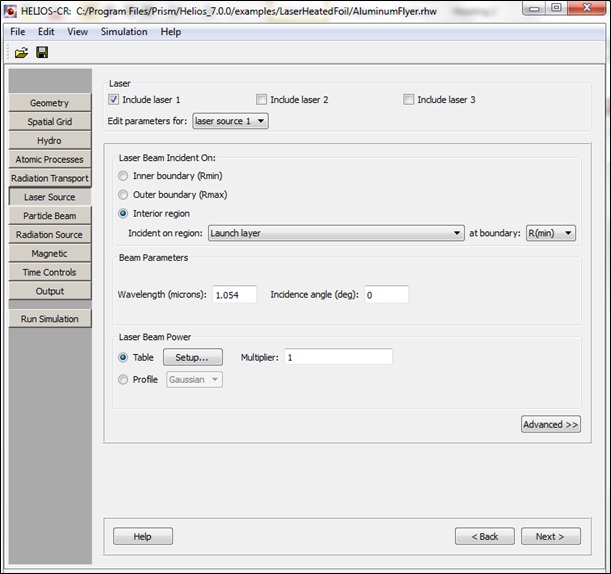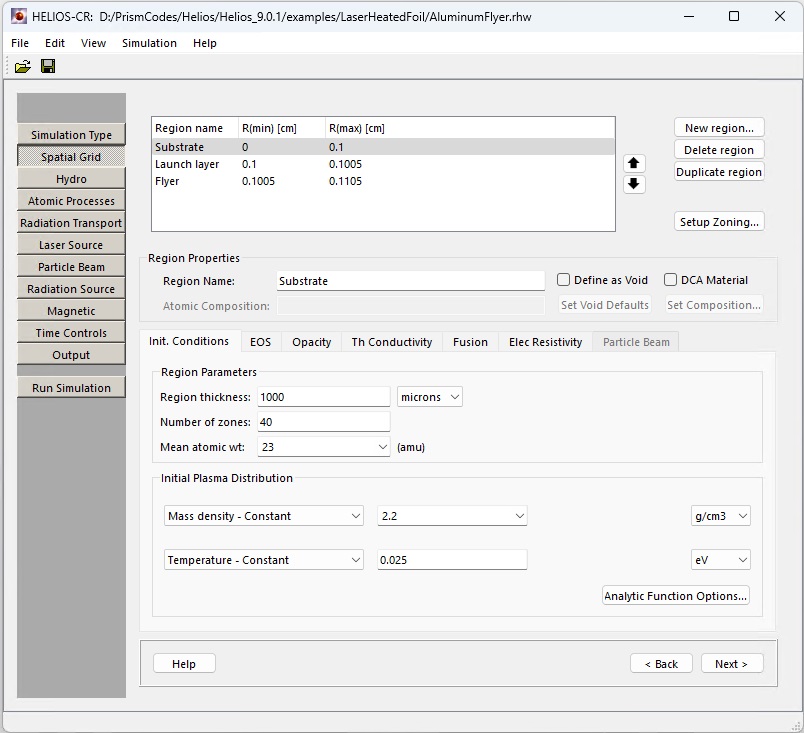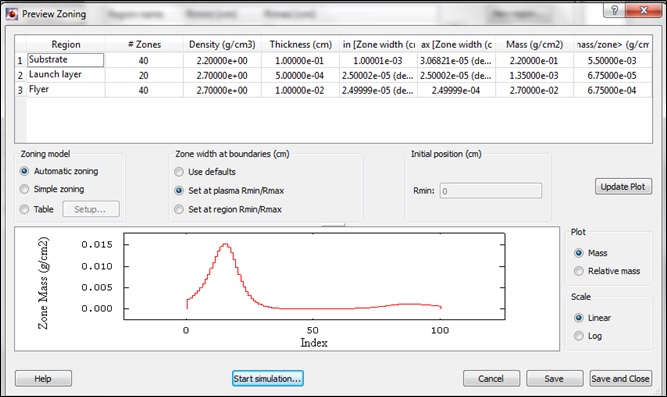 Boundary conditions: usually the boundaries of the plasma are allowed to expand freely. If required, the boundaries can be held stationary by unchecking the Rmin and/or Rmax boxes.