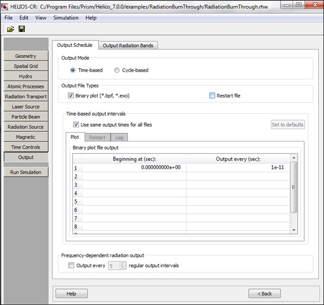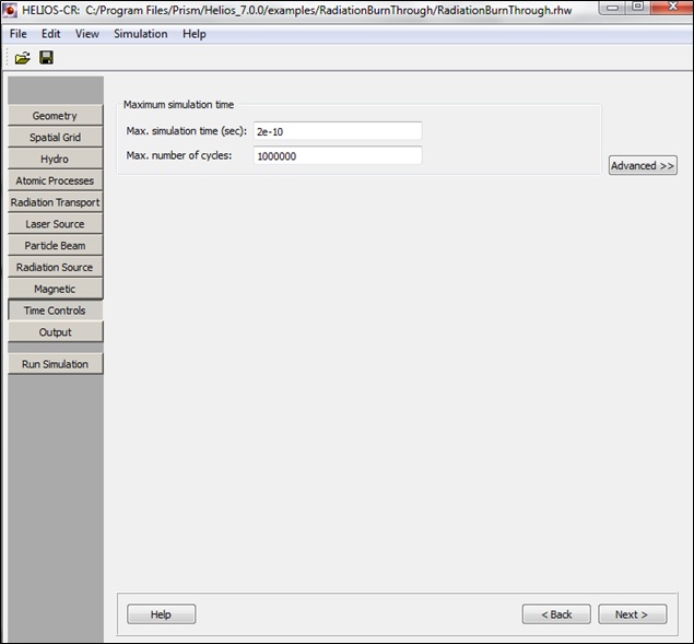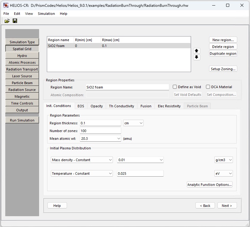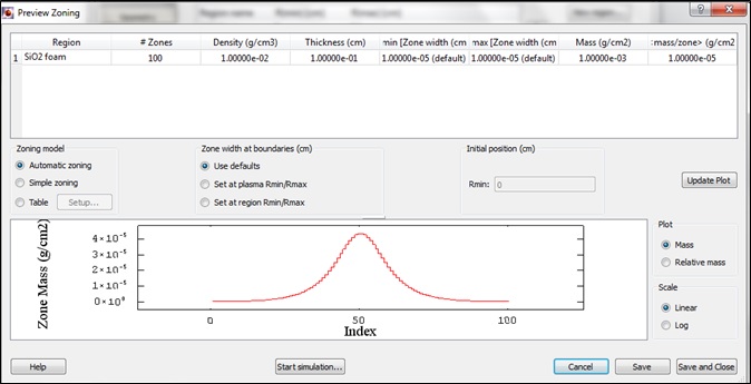 Boundary conditions: usually the boundaries of the plasma are allowed to expand freely. If required, the boundaries can be held stationary by unchecking the Rmin and/or Rmax boxes.