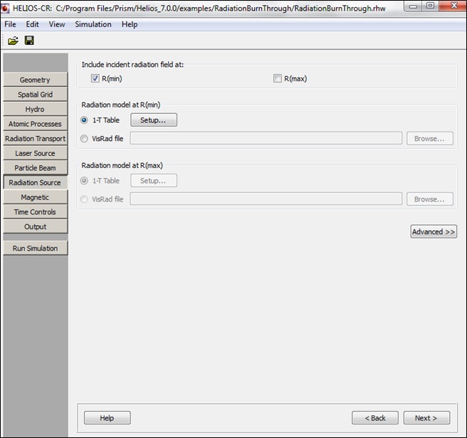 An external radiation source can be applied to the hydro grid boundaries during simulation. For planar geometries an external source can be applied at the inner boundary (R(min)) and/or the outer boundary (R(max)). For cylindrical and spherical geometries, an external source can only be applied at the outer boundary. The time-dependence of the flux is based on interpolated radiation temperatures from the 1 - T table. The photon energy-dependence is determined assuming a Planckian source with a temperature given by the radiation temperature.