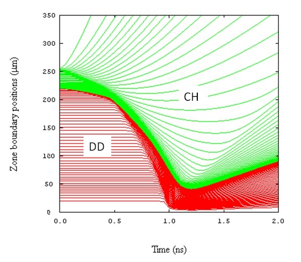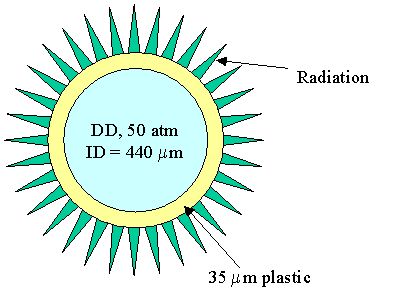 In this calculation, a plastic micro balloon (wall thickness - 35 micron, internal diameter - 220 micron) is filled with 50 atm DD. The capsule is driven by 200 eV radiation for 1 nanosecond. This system is representative of indirectly driven capsule implosion experiments at OMEGA.