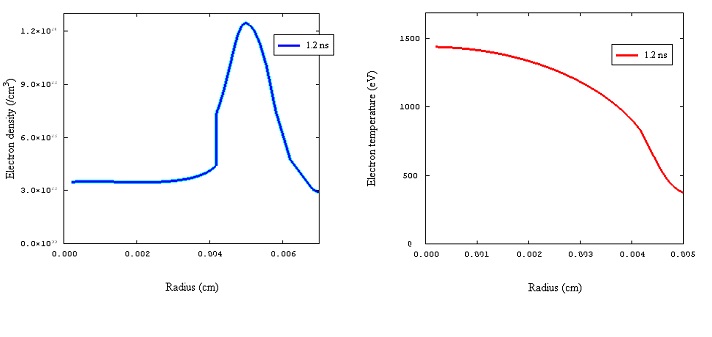 Simulation Results: Plasma core temperature and density distributions around the time of implosion stagnation (1.1 ns).
