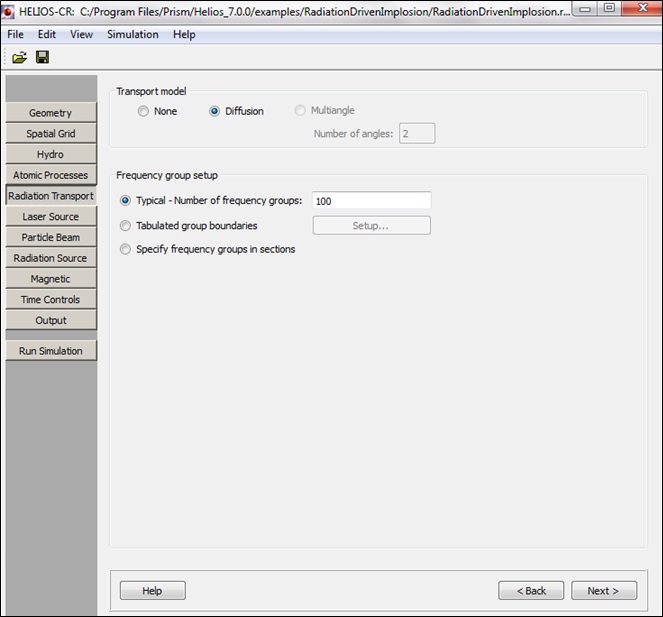 The radiation transport is performed using one of the following: a multi-group, flux-limited Diffusion model (most commonly used in rad-hydro codes), or a multi-group, Multiangle long characteristics model (more accurate, but potentially slower), or None – radiation transport is ignored. The radiation heating and cooling will still be computed. At present, the multi-angle model can be utilized only in planar geometry.