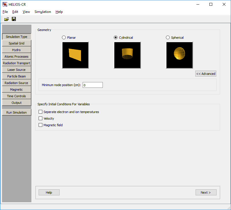 HELIOS can perform 1-D radiation-hydrodynamics simulations in planar, cylindrical, or spherical geometry.