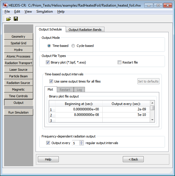 During a HELIOS simulation, output is generated for a Log file, a Plot file, and a NetCDF file. The frequency at which data is written to these files is controlled by the Output parameters widget.