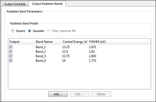 The radiation bands can be defined using either Square or Gaussian bands, or by supplying a Filter Response File. Parameters for the radiation bands are specified in the Output Radiation Bands tab of the Output Widget.