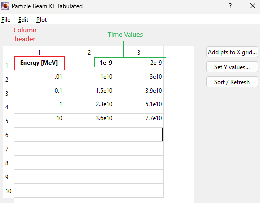 The Table File option can be used by browsing for a text file with the following format. This would enter the same values as the table above: