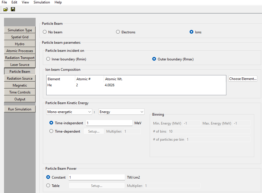 Energy can be deposited into the hydro grid by an incident ion beam or electron beam. The particle beam kinetic energy and power can be specified to vary with time, and also by various kinetic energy (KE) distributions.
