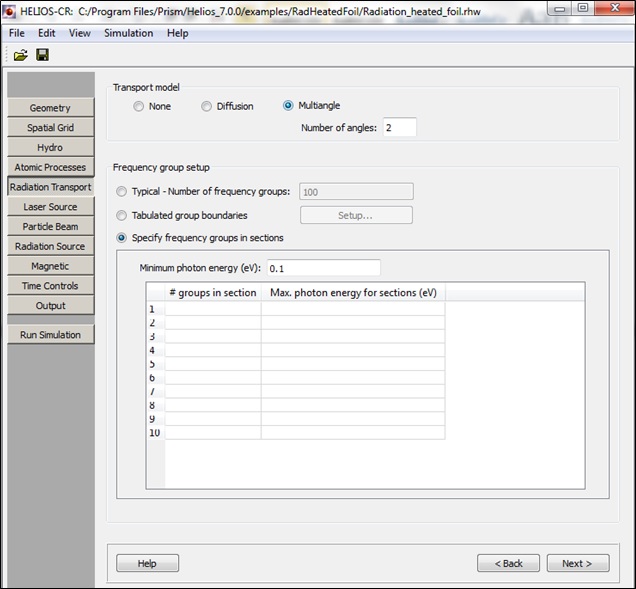 - Specify Frequency Groups in Sections: The spectrum is divided into "sections" (or spectral ranges), the number of which is given by the number of filled table rows. For each section, the number of groups and the upper bound of each section of groups is specified. This allows the user to specify high frequency resolution in one spectral range, and a coarser frequency resolution in another range.