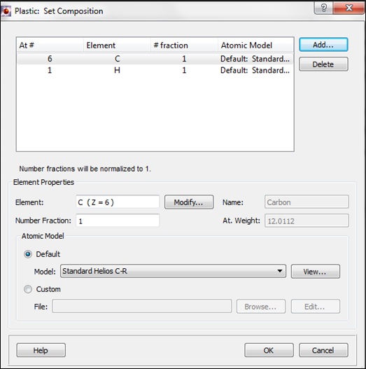 In the Set Composition dialog, click on the Add button to select an element from the periodic table. In the periodic table that appears, click on the desired element. The element's parameters will be entered in the boxes on the dialog. Set the number fraction of the element in the Number Fraction box. Number fractions will be automatically normalized to 1.