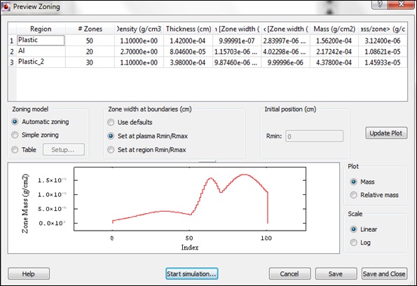 After setting up each of the spatial regions for the HELIOS simulation, the zoning (or mass distribution of zones) must be set up. In most cases, this can be accomplished using the Automatic Zoning option. For a Lagrangian code, it is important to have a smooth distribution of zone masses. Generally, relative mass differences between two adjacent zones should be within a few tens of percents.