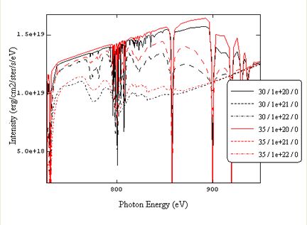 The figure below shows a plot from PrismSpect. The lines represent spectra at different temperatures and densities.