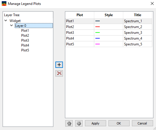 The legend uses a legend controller system to edit which plots appear in the legend. When the legend dialogue is opened in spectraPLOT a "Manage Plots" button is availible which brings update a layer tree based selection system.