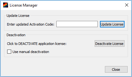 To free up an activation seat for a different computer to use, a user may deactivate the license on the current computer. This option is located in the License Manager dialog, shown above. Users not behind a security firewall can click Deactivate License to deactivate online. Otherwise, manual deactivation can be initialized with the check box in the lower left. This will require email communication with Prism. Further instructions will appear when this checkbox is checked.