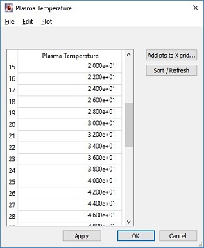 To enter the evenly-spaced points between 2 and 60 eV, select the Add Pts to X Grid button. Then in the popup dialog, select Linear in the Set Spacing area; set 2 for the Min. Value, 60 for the Max. Value, and 30 for the Number of Grid Points. Then press Apply. This will add 30 points to the table, starting at 2 eV and ending at 60 eV.