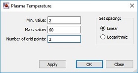 For the ion density grid, make sure the Simple Grid radio button is pressed. Enter 41 for the number of points, and 1.0e19 and 1.0e23 for the Min and Max values, respectively.