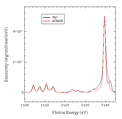 Simulation results for Ar-doped DD plasma at 600 eV temperature and 1 g/cc density computed with FAC and ATBASE data. Ar He-alpha transition and associated Li-like satellites.