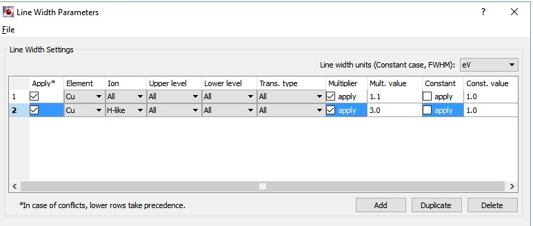 Clicking on the Add button adds a row with default settings. The element, ionization stage, upper and lower level principal quantum numbers, and the transition type can all be chosen via combo boxes. There is an option to use with a multiplier on the model line width or a constant value for the FWHM (full width at half-max). When a constant value is specified, the units to be used are specified in the combo box in the upper right of the dialog. The choices are: eV, Angstroms or milliAngstroms.