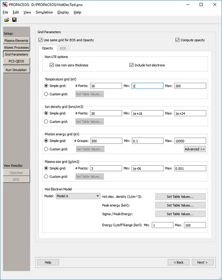 The Grid Parameters widget is used to specify the grids for each of the independent variables in the calculation (e.g., temperature and density), and the photon energy grid.