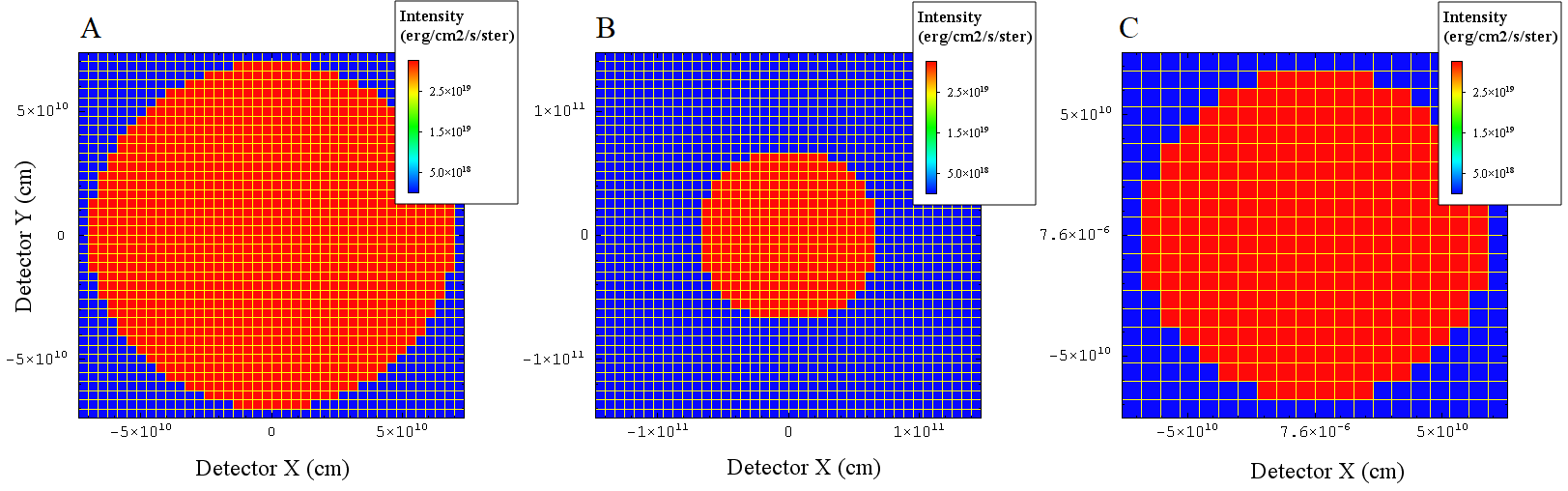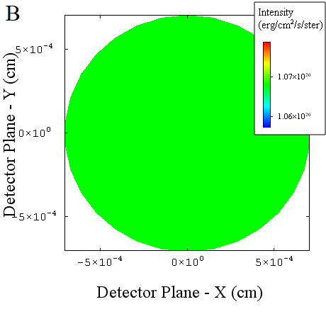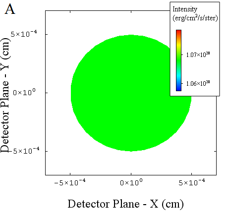 Notice that, in a case like this (entire source solid angle visible, and constant specific intensity), the spectral flux (and thus the absolute power) is independent of the size and density of the SPECT3D pixels used, and is also independent of the of the amount of dark area included around the source: