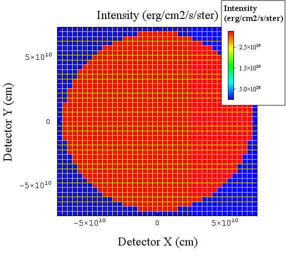 Each pixel displays the frequency-integrated specific intensity, exiting the plasma, calculated along a LOS at the center of the pixel. Here, we are saying that our entire physical detector is sensitive to each of these solid angle sections of the sun. Thus, the intensity calculated from each of these solid angle sections is covering our entire physical detector area. (Here it is important to consider the three approximations listed below, especially #1. In this scenario, most of our viewing angle of the sun is not parallel to the central axis, as each LOS calculation assumes. However, the further the detector is from the source, the better this approximation is.)