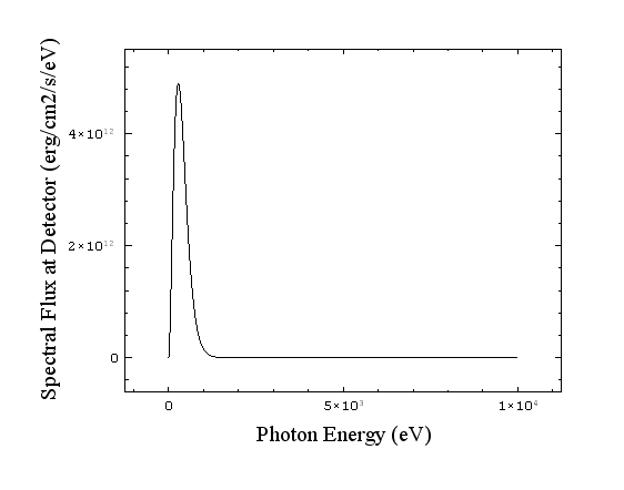 We can also plot a spectrum, which SPECT3D determines by multiplying each pixel's (frequency-resolved) specific intensity by its solid angle (again, the solid angle of the plasma subtended by the pixel), and summing over pixels, thus producing a total spectral flux (erg/cmˆ2/s/eV):