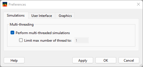 The first tab of the preferences window is to control the multi-threading of the calculations performed. The option is enabled by checking the Perform multi-threading simulations box. To limit the number of processors used, check the Limit max number of threads to checkbox and enter the number to be used. If this box is not checked or if the number entered exceeds the number of processors available, all all available processors will be used.