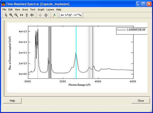 Spatially integrated spectra are displayed by clicking on the Time-Resolved Spectra button on the main window when one or more time steps are selected. The spectra for all selected time steps will be displayed in the same graph. By default, the spatially integrated spectra will be shown. The combo box in the Plot options panel will have options for the spatially resolved spectra, if they are available.