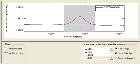 The Spectral bands panel will list the names of any bands defined in the Band Intensities window. If any of the Show ... check boxes are checked, the corresponding item will be shown in the plot for any band or bands selected in the list. An example is shown below: