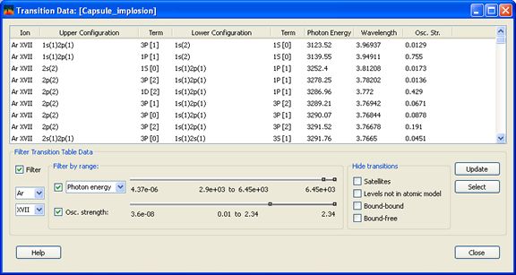 As an aid in identifying transitions in the spectrum, if a transition line is clicked in the spectrum, the corresponding transition will be shown in a box on the tool bar and shown as selected in the table. Conversely, a transition selected in the table will be shown as selected in the plot.
