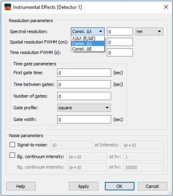 - Noise parameters. Random noise, based on Poisson statistics, will be added to the spectra shown on the Time Resolved Spectra display.