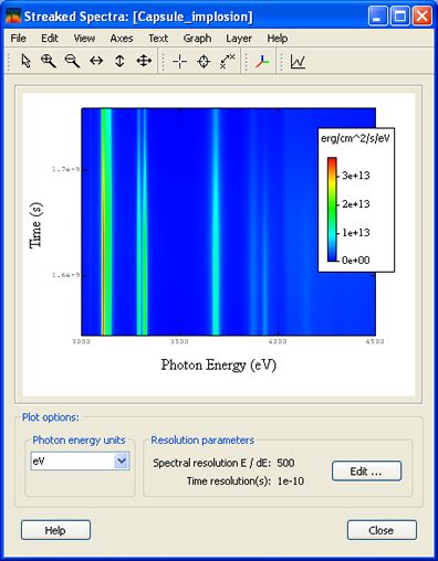 Streaked spectra are displayed by clicking on the Streaked Spectra button on the main window when more than one time step is selected. The plot shows the time evolution of the spectrum.