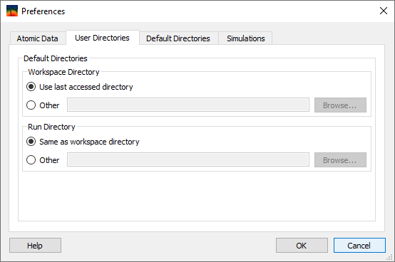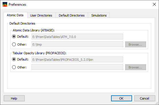 When selecting the Default button for the Atomic Data Library or the Tabular Opacity Library, SPECT3D utilizes the default directory (which can be altered in the Default Directories tab, described below). With the Other button, the user can explicitly set the directory path for each of these libraries.