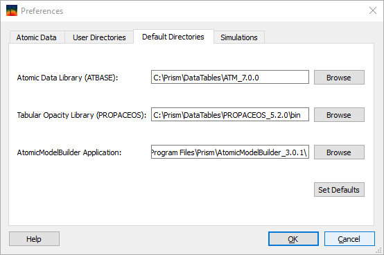 When SPECT3D is run for the first time (in which case no preferences file is detected), default directories for the Atomic Data Library, the Tabular Opacity Library, and the path to the AtomicModelBuilder application are initialized by the SPECT3D application. For Linux and Mac OSX platforms, these paths are set assuming the default Prism applications directory structure. For Windows platforms, they are initially set using the environment variables PCS_ATBASEDATA_DIR, PCS_PROPACDATA_DIR, and PCS_AMB_DIR, respectively, if they exist (they are typically set up during the installation of ATBASE and PROPACEOS data, however environment variables for Windows platforms are editable using System in the Control Panel folder). On all platforms, these default directories are editable in the Default Directories tab, and may need to be changed when: