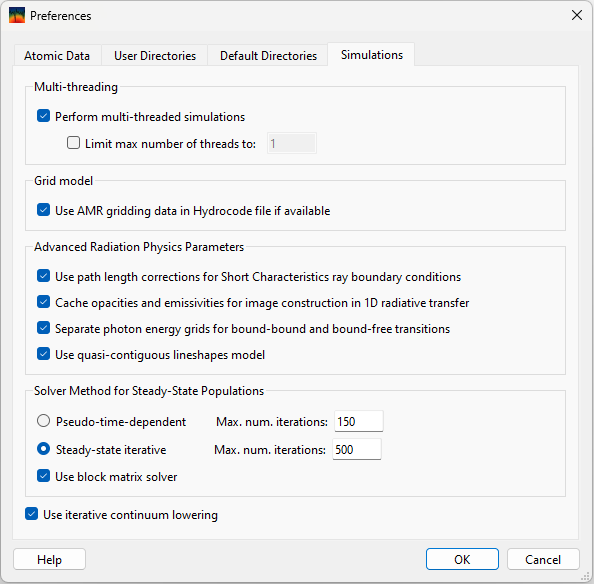 Use block matrix solver: applies only if "Steady-state iterative" is selected for the populations solver. This is a custom designed linear equations solver grouping a larger number of atomic levels in a smaller number of blocks. Each block typically consists of one ionization stage. The solution to the original system of linear equations is obtained iteratively by solving the populations of blocks. Once the block populations are known, the smaller system of equations for individual levels in each block are solved one block at a time. The iteration continues until the solution of all levels and blocks reaches self-consistency.