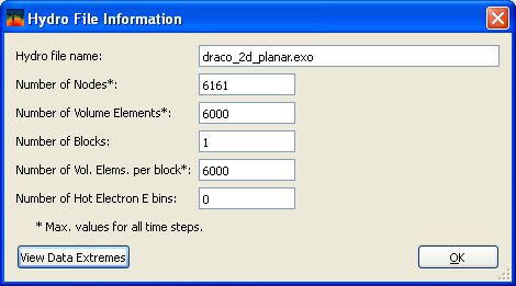 Summary information for data contained in an EXODUS file can be displayed by selecting the menu item Display | Hydro File Info.