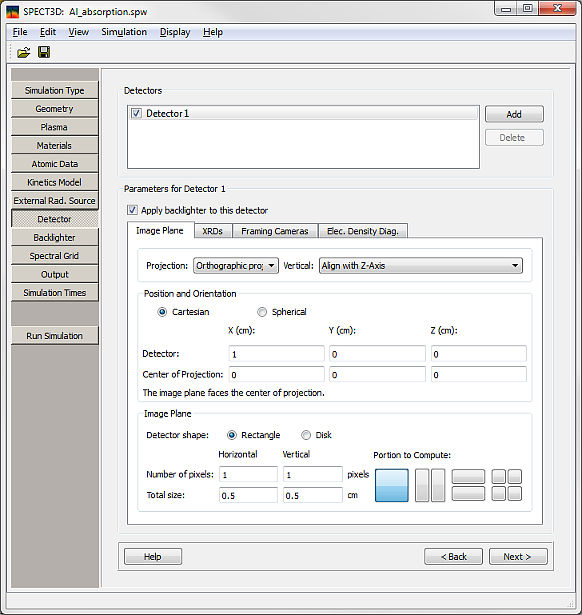 - For the position of the center of the detector enter 1 (X), 0 (Y), and 0