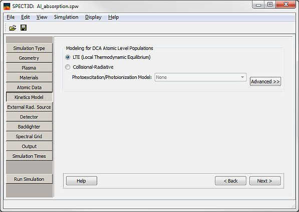 Click on the Kinetics Model button or on the Next button on the Atomic Data page.
