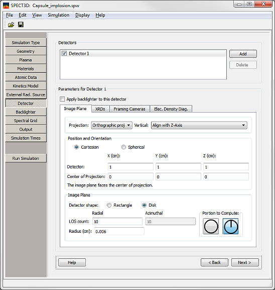 - For the position of the center of the detector enter 1 (X), 1 (Y), and 1