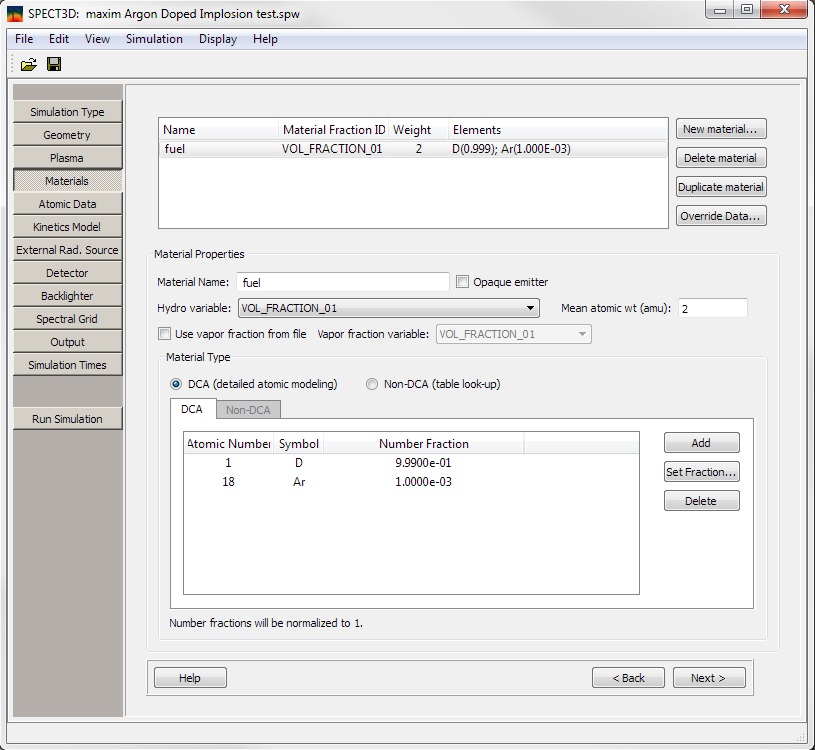 - Material Type: leave the default selection of DCA (detailed atomic modeling).