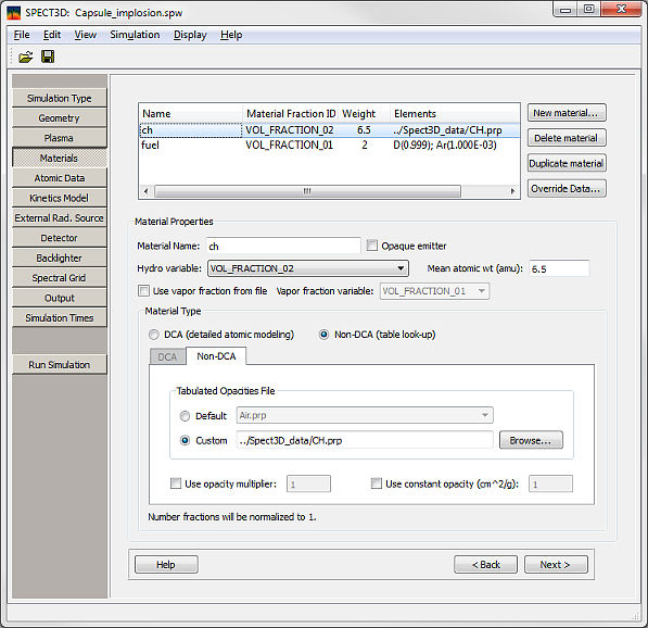 - Select the Custom radio button, click Browse and search for the CH.prp tabulated opacity file in the Examples -> Spect3D_data folder.