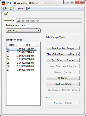 Results of Spect3D calculations can be viewed with the Visualizer utility. Visualizer can be started at the end of the calculation or at any time after the calculation is completed by double-clicking on the file <run_name>.swc in <run_name> directory (in this example Capsule_implosion_run.swc). The Visualizer main window appears. Depending upon the type of the calculation, some of the options may be disabled.