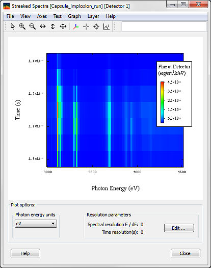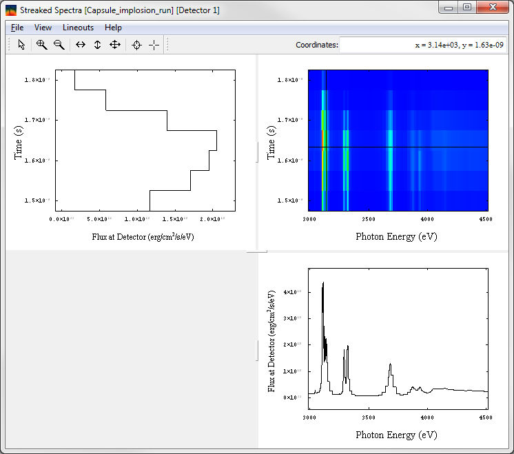 energy and instantaneous spectra (vertical and horizontal lineouts respectively):