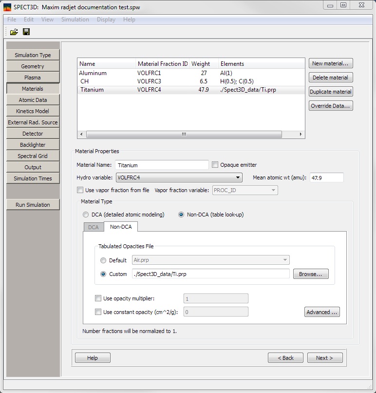 - Click on Custom, click Browse and look for the Ti.prp file in the Examples -> Spect3D_data directory.