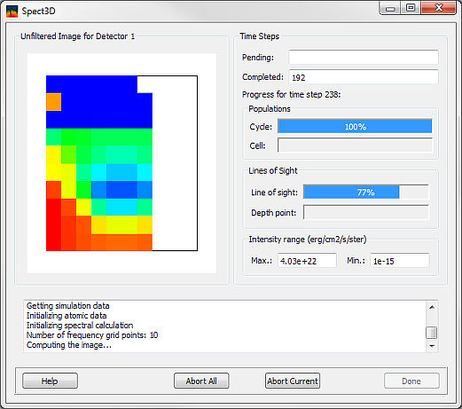 The progress of the simulation can be followed on the progress monitor. Since this is an LTE calculation, the Populations progress bars will remain blank. The Lines of Sight progress bars will update as the image points are computed for each line of sight.