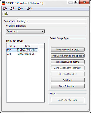 Results of Spect3D calculations can be viewed with the Visualizer utility. Visualizer can be started at the end of the calculation or at any time after the calculation is completed by double-clicking on the file <run_name>.swc in <run_name> directory (in this example Radjet_run.swc). The Visualizer main window appears. Depending upon the type of the calculation, some of the options may be disabled.