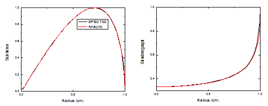 Figure below presents the results of SPECT3D simulations and their comparison against the analytic solutions. In the simulation, the temperature is sufficiently high to ensure that the plasma is completely ionized. The mass density of a plasma was chosen such that the logarithm of the index of refraction is a simple function of radius r and is not a function of an axial variable z: