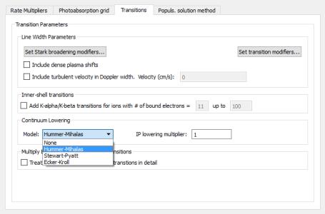 The check box for turning off the ionization potential energy shift due to continuum lower has been replaced by a multiplier. Setting the multiplier to zero turns off the energy shift.